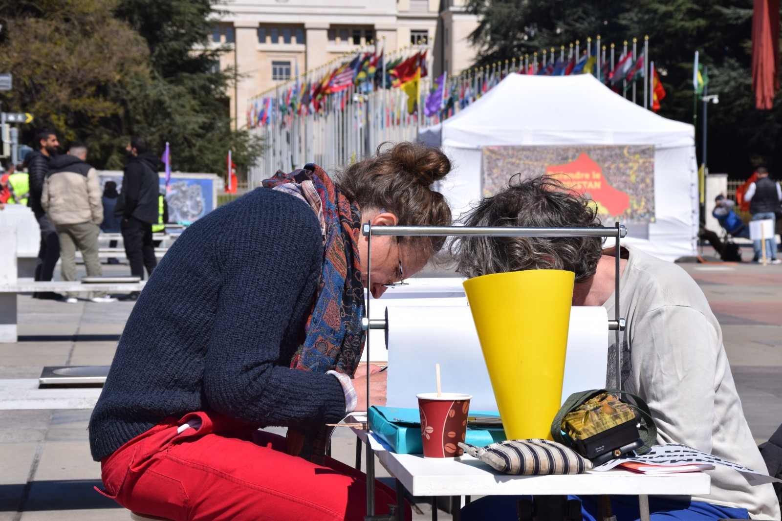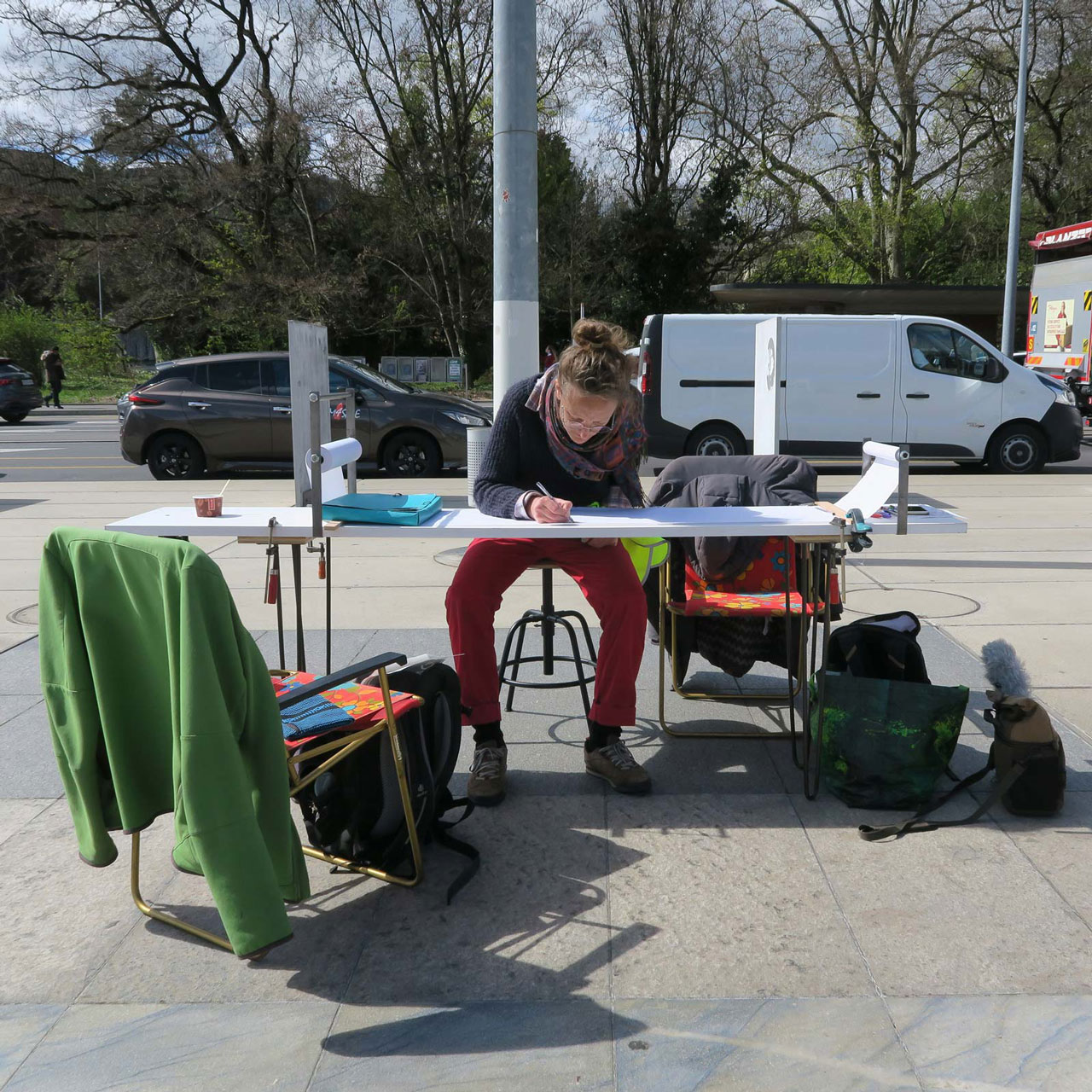 Emilie Renault et Ghislain Botto posent papier, stylo et micro sur la place des Nations à Genève durant une semaine. Face à l’ONU, cette place bruyante toute de gris et de drapeaux vêtue, cernée de routes et d’ONG localisées dans le secteur est destinée aux manifestations, aux revendications et autres rassemblements.