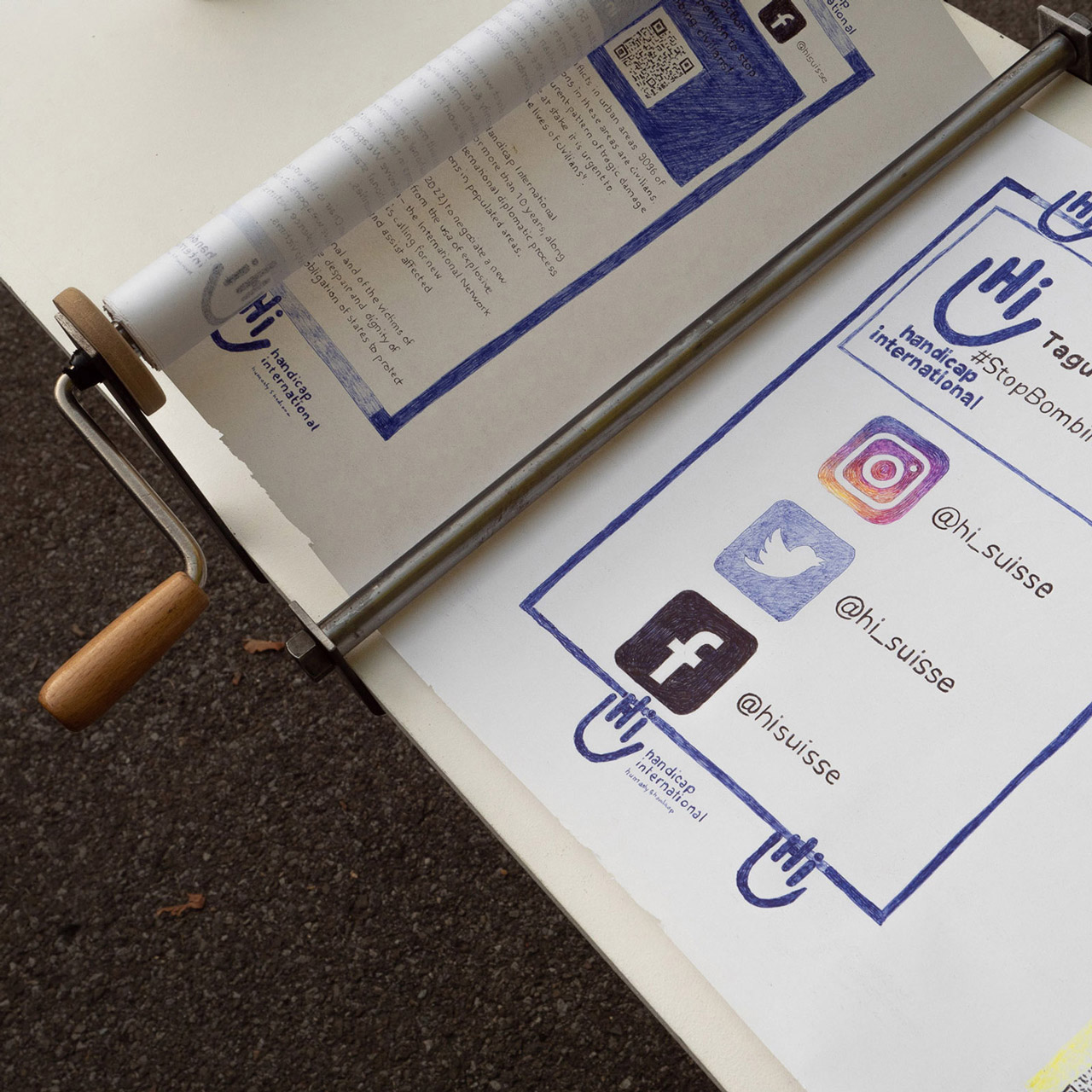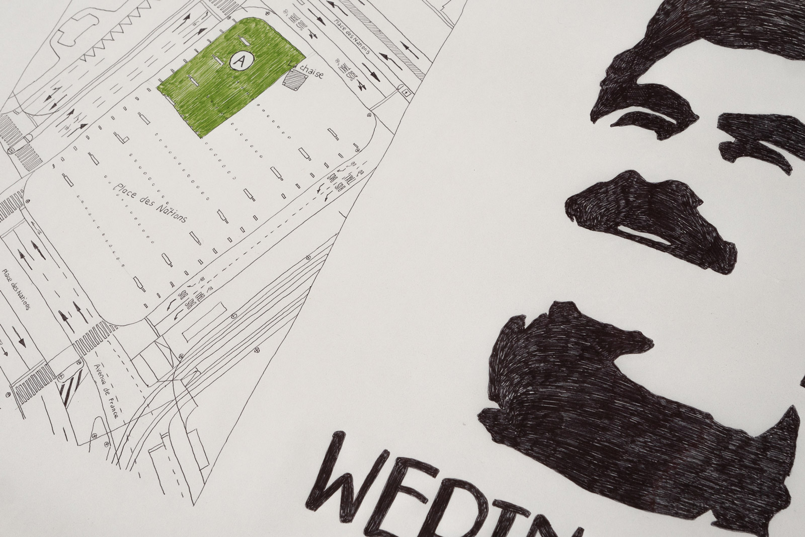 Selon un jeu de patience lent et vain en apparence, tel une turlutaine d’orgue de Barbarie, le rouleau se couvre des graffitis, clameurs graphiques offertes par la place aux illusions d’expressions libres tombées dans l’oubli. Le BAR et son logo, ceint de lauriers victorieux reprenant la composition formelle du graphisme des ONG historiques, se propose alors d’être la mémoire de ces récits individuels ou collectifs et de représenter les luttes en cours à leur juste mesure. Un nouveau monde se dessine ainsi, au prisme de cette richesse humaine et des espoirs rassemblés place des Nations.
