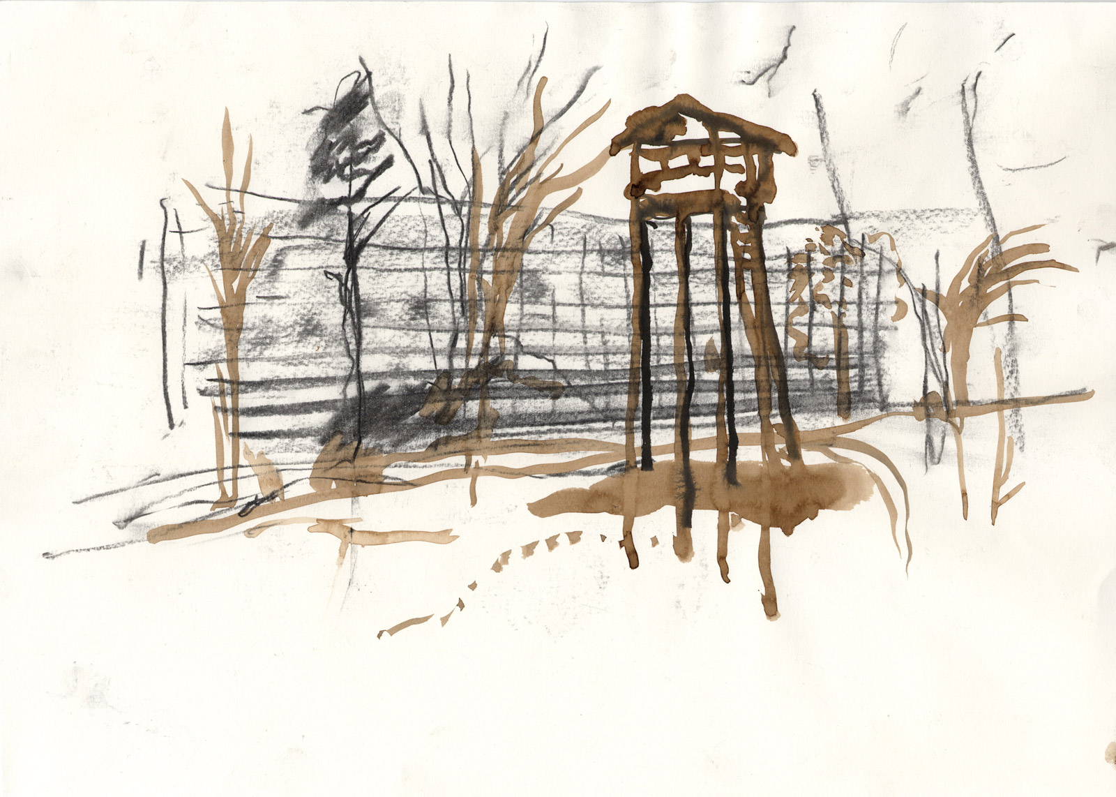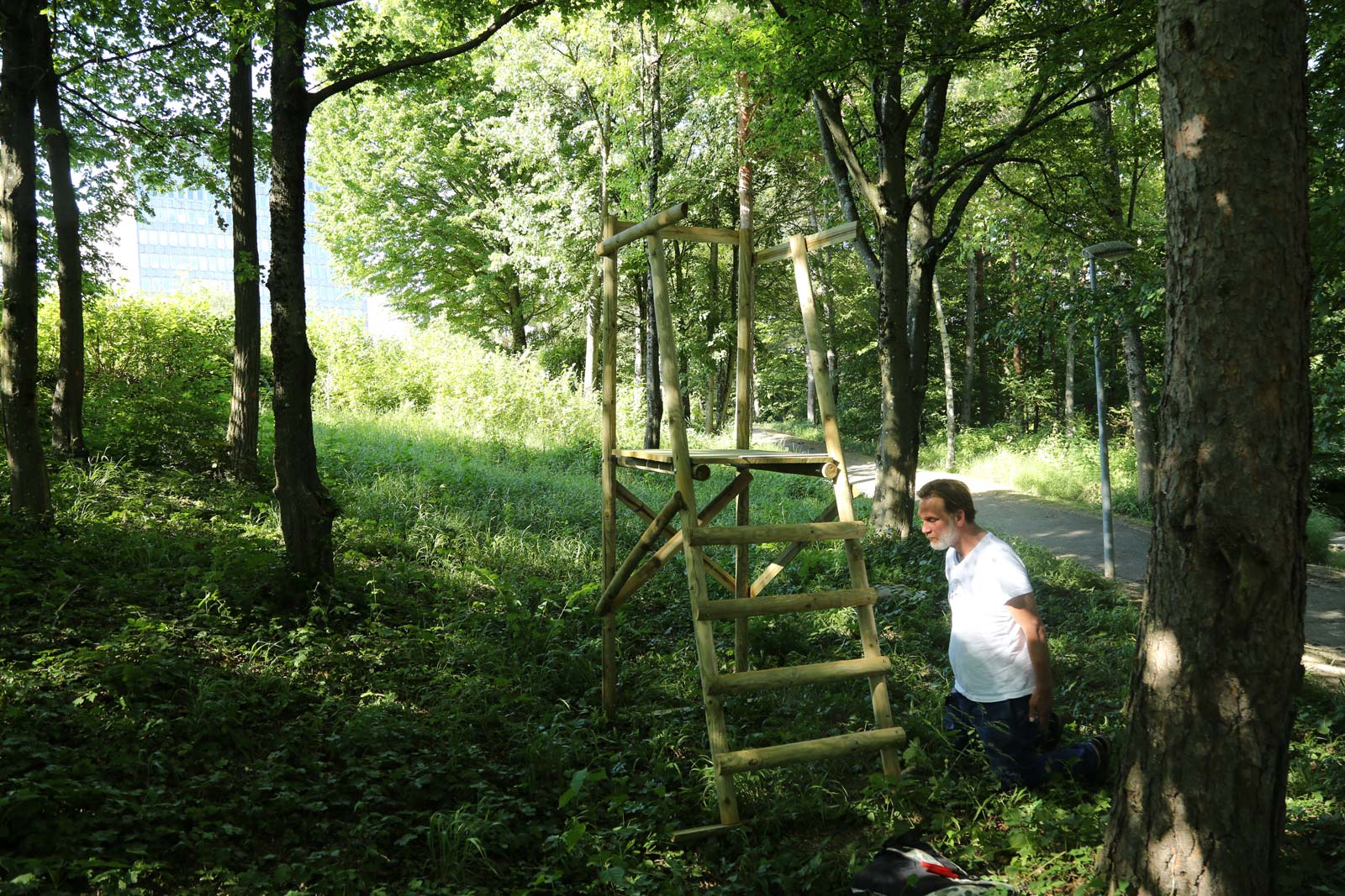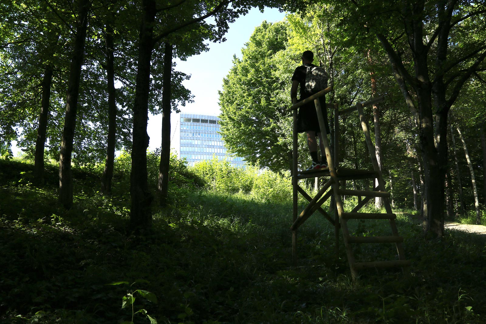 Aux abords du site du Grand-Morillon, un mirador d’affut a été installé non loin de la future ligne du tram des Nations, dans un parc face à l’Organisation Internationale du Travail (OIT). L’installation vise à interroger la notion de dispositif – en référence à Giorgio Agamben – et s’inspire de Sylvain Tesson et ses chemins noirs, de Baptiste Morizot et sa piste animale. L’observatoire cherche également à jouer avec les notions d’espaces publics et privés, en particulier dans ce contexte international aux dispositifs de sécurité particuliers, dont les normes onusiennes H-MOSS (Normes minimales de sécurité opérationnelle) qui empêcheront à terme l’accès du parc aux citoyen.ne.s genevoi.se.s. Possibilité de réensauvagement d’une partie d’un territoire hyper-urbain vers l’hyper-rural, enjeux environnementaux versus enjeux sociaux, le mirador est-il un observatoire de la faune et de la flore ou bien au contraire un objet de défiance face aux dispositifs ? Qui regarde qui ?